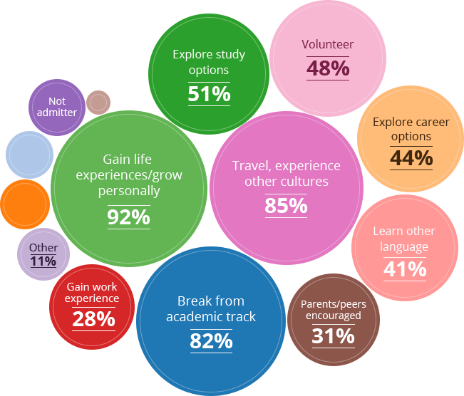 - For most students, Gap experiences have an impact on their choice of academic major and career – either setting them on a different path than before a Gap year or confirming their direction (60 percent said Gap years either "set me on my current career path/academic major" or "confirmed my choice of career/academic major"). (Source found here.)
